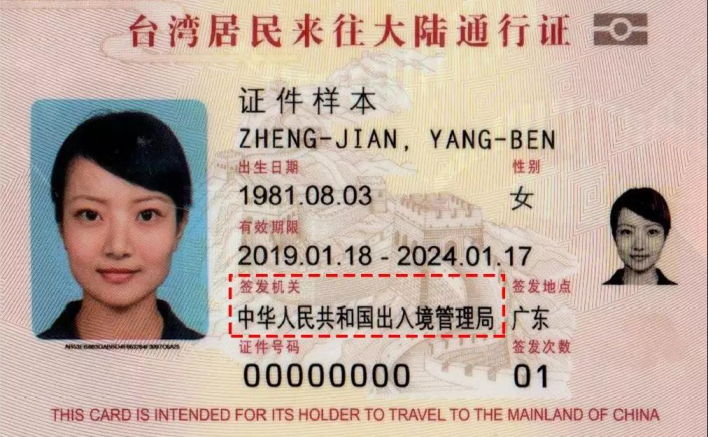 2019年4月起,臺(tái)灣居民來(lái)往大陸通行證簽發(fā)機(jī)關(guān)調(diào)整為中華人民共和國(guó)出入境管理局。