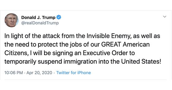 美國當(dāng)?shù)貢r間4月20日晚上,特朗普在沒有知會白宮相關(guān)工作人員的情況下,率先于Twitter上發(fā)了一條新的“施政綱領(lǐng)”。