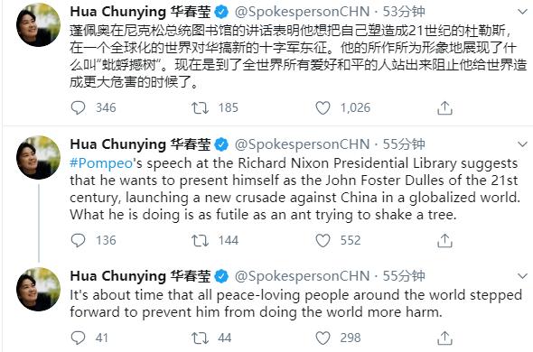在如今美國剛宣布關(guān)閉中國駐休斯敦總領(lǐng)館,蓬佩奧接著又大放厥詞,對中國內(nèi)政外交進行污蔑,對此,美媒將蓬佩奧的此番發(fā)言預(yù)測描述為“新冷戰(zhàn)檄文”的演講。面對蓬佩奧如此咄咄逼人,我國外交部發(fā)言人華春瑩在推特上火力全開,用中英雙語對蓬佩奧的言論展開回擊。