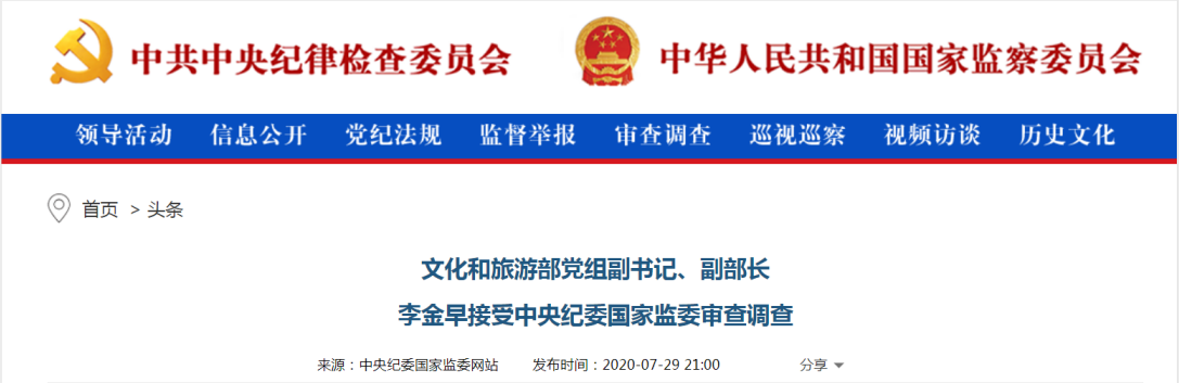 7月29日晚,中央紀(jì)委國家監(jiān)委網(wǎng)站發(fā)布消息,文化和旅游部黨組副書記、副部長李金早涉嫌嚴(yán)重違紀(jì)違法,目前正接受中央紀(jì)委國家監(jiān)委紀(jì)律審查和監(jiān)察調(diào)查。