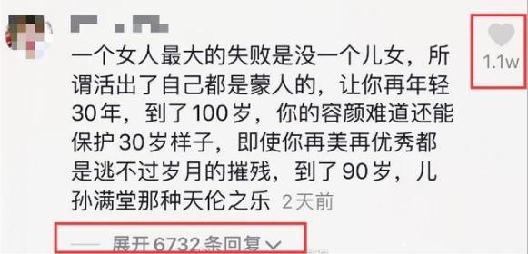 前段時間,舞蹈藝術家楊麗萍分享的視頻下方出現(xiàn)了這樣的評論:“一個女人最大的失敗是沒一個兒女,所謂活出了自己都是蒙人的?!薄吧怀龊⒆泳褪鞘??!?/span>
